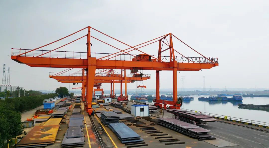 湘潭港顺祥码头是湘潭钢铁集团的宽厚钢板专用码头,这里拥有全球最大的宽厚钢板生产基地。码头主要由三个千吨级泊位构成,丰水期最大可停泊5000吨级船舶。码头装卸采用1台50吨门座式起重机和3台40吨龙门式起重机,4台起重机(即天车)全部进行了智能化改造,并采用先进的5G技术远程操控,实行24小时作业。