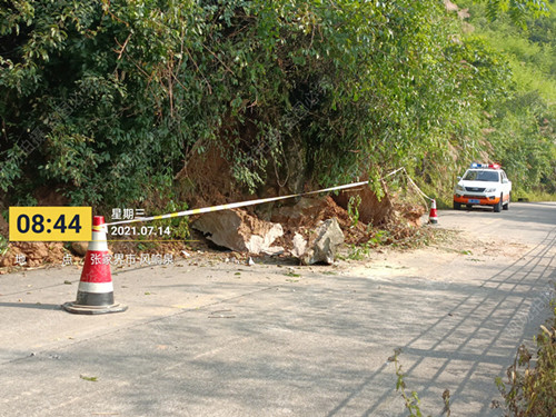 7月12日晚,张家界市武陵源境内大雨倾盆,13日19时50分左右,S303线K292+400处风响泉路段传来几声巨响,黄泥裹挟着巨石垮塌在路面上,阻断交通。武陵源区公路建设养护中心接险情报告后,立即启动防汛保畅应急处置,第一时间安排就近的天子山养护道班工作人员紧急赶到现场,查看灾情,设置警示标志。