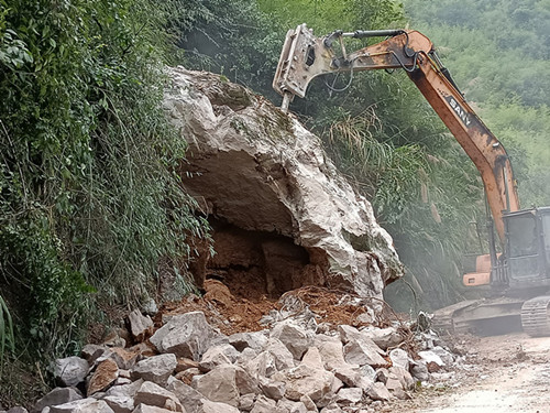 因右侧垮塌方量大,7月14日8时左右武陵源区公路建设养护中心分管养护安全领导带领应急抢险队员火速赶到现场,马上制定处置方案,调度抢险机械和运输机械火速增援,采用炮机破开巨石。施工现场,两名安全员现场维护交通引导车辆安全通行。在连续奋战近十几个小时后,所有垮塌在路面和水沟上的巨石与黄泥被清理干净,全幅路面恢复畅通。