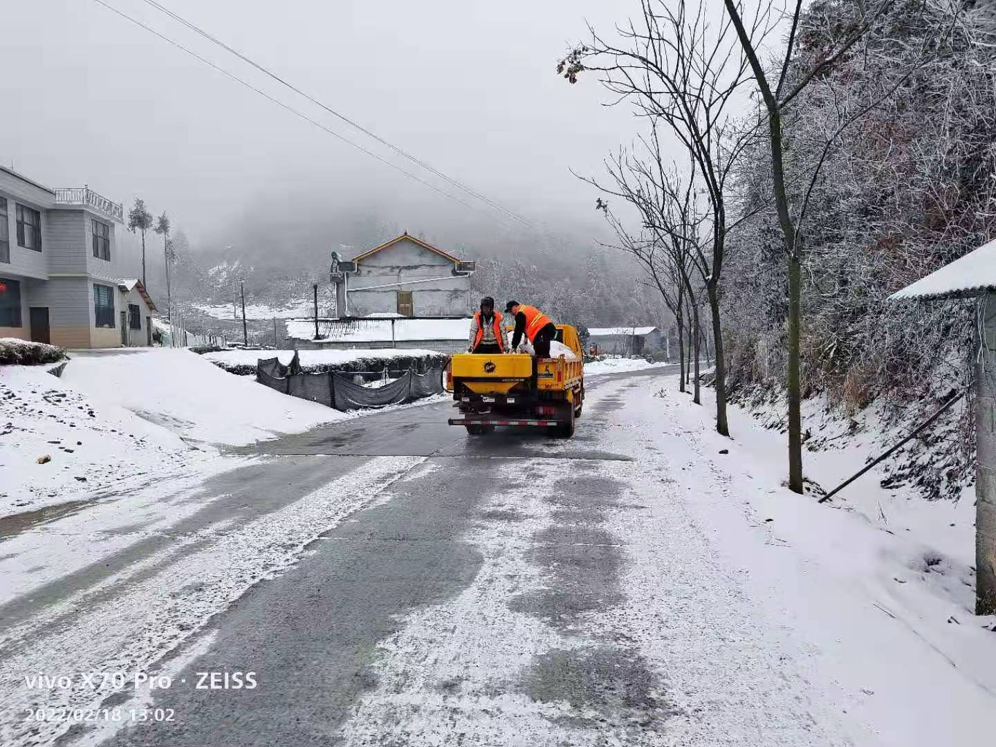 2月18日下午,石门县公路养护中心工作人员在省道502线南北镇段布撒融雪剂,确保道路安全畅通。