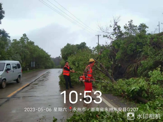 5月5日晚至5月6日,东安县境内遭遇持续性强降雨袭击,因雷雨大风强对流天气导致G207线、S238线、S236线东安段多处出现水毁、行道树倒伏、路面积水等险情,严重影响车辆行车安全。