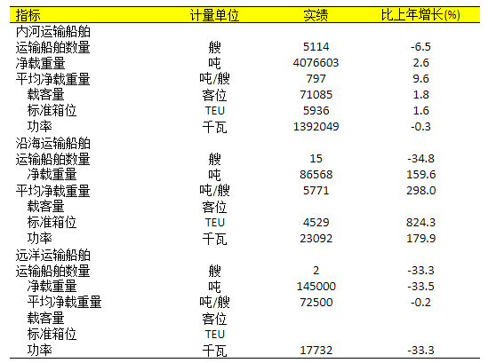 年末拥有轮驳船5131艘,比上年减少6.6%;净载重量4308171吨,增长1.9%;载客量71085客位,增长1.8%;集装箱箱位10465TEU,增长65.3%。