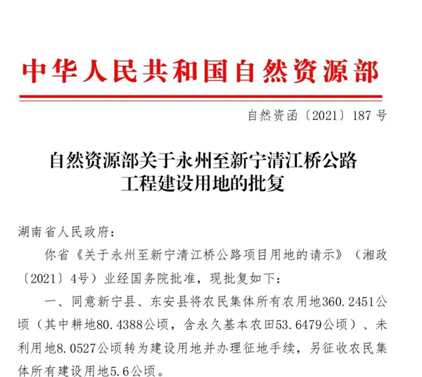 近日,永新高速公路项目建设用地获自然资源部批复(自然资函〔2021〕187号),共计批准建设用地373.8978公顷。