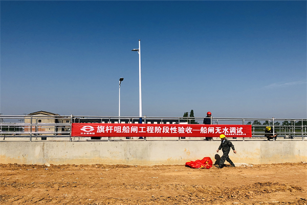 湖南省藕池东支-华容河航道建设一期工程为我省首个设计施工总承包(EPC)水运工程项目,旗杆咀船闸按IV级标准建设,船闸主尺度为145m×12m×3.5m(有效长度×宽×门槛水深),设计船型为500t级货船,兼顾1000t级货船,由湖南省航务工程有限公司承建。4月26日上午,在各协作单位的通力合作和不懈努力下,按照交通运输部有关要求,岳阳市交通质安站现场监督船闸无水调试全过程,无水调试工作进展顺利。