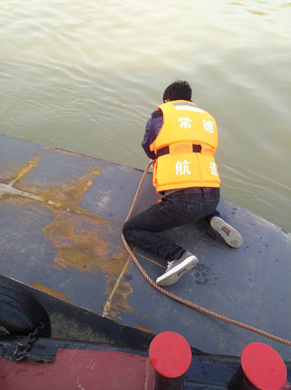 常德保河堤航道处工作人员在朱家垸7号白单船标上挂绳索,吊正该标志船