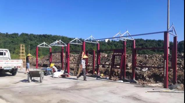 工作队在村口修建公交车站台,为村民出行提供便利。