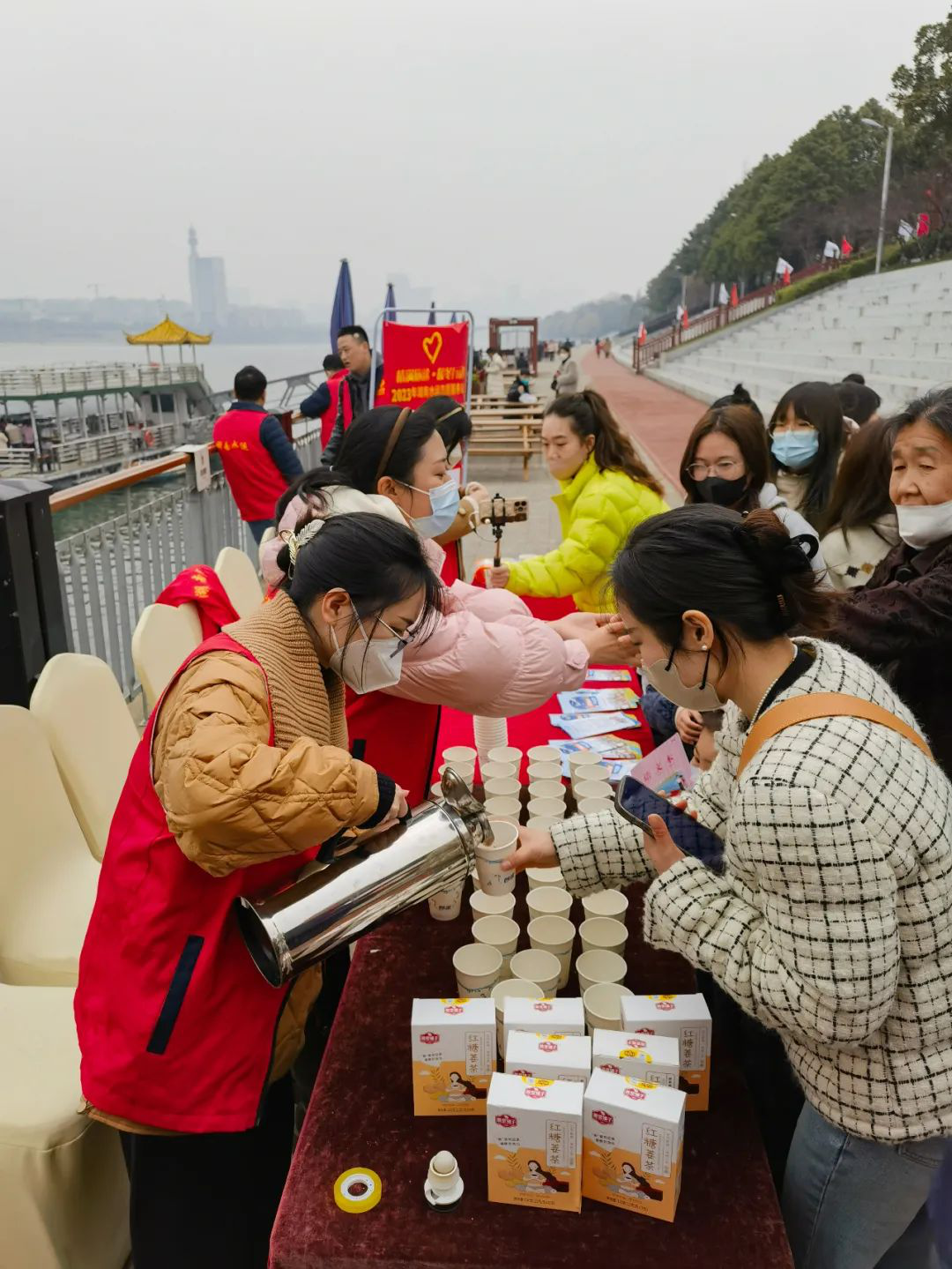志愿者们在长沙橘洲客运码头为游客提供姜茶。