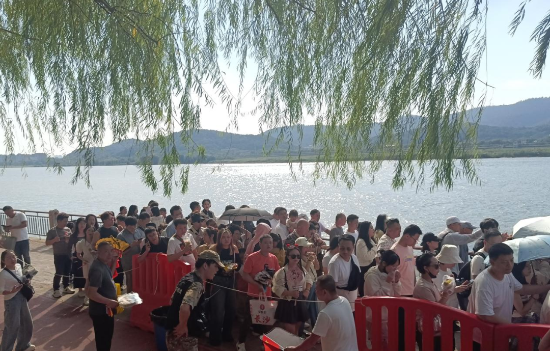 国庆期间在长沙橘洲旅游码头等候乘船的游客。