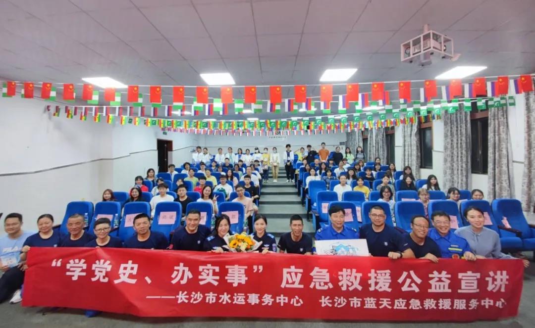 5月13日,长沙市水运事务中心与长沙市蓝天救援服务中心志愿者来到中南林业科技大学,为200余名在校大学生宣讲水上应急救援知识,开展“我为群众办实事”水上安全教育实践活动。