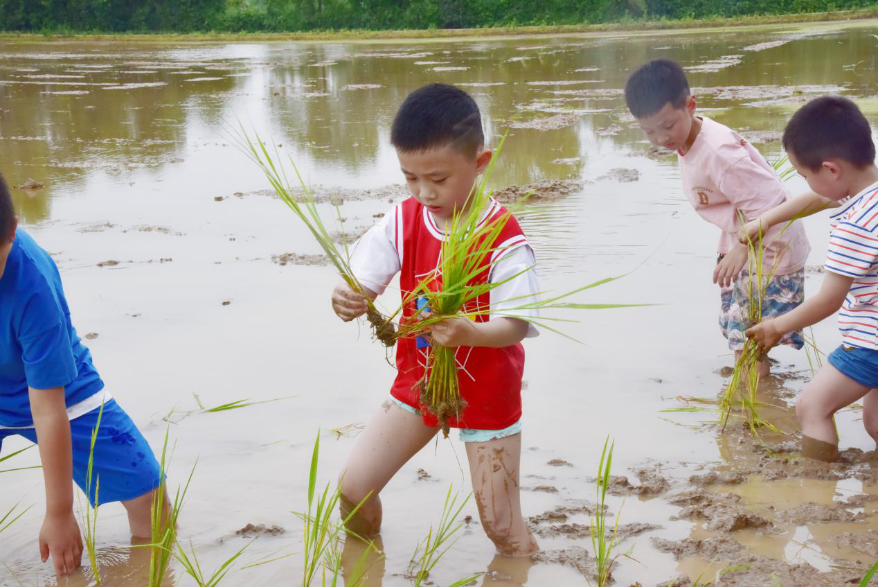 在快乐小农夫活动中,向导老师向小朋友们介绍水稻的由来和播种过程,并切身体会传统农耕工具的使用,让大家感受“一粥一饭当思来之不易”,并通过让孩子们制作自然颜料布袋、插秧、捉泥鳅等环节近距离接触大自然,在满是绿色的田野里,体验做农夫的快乐。
