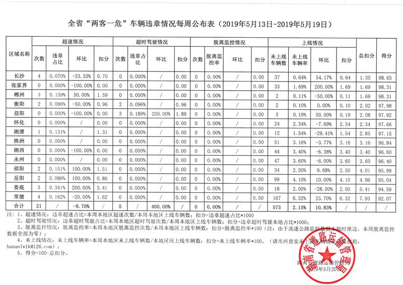 全省“两客一危”车辆违章情况一周公布表(2019年5月13日—5月19日)