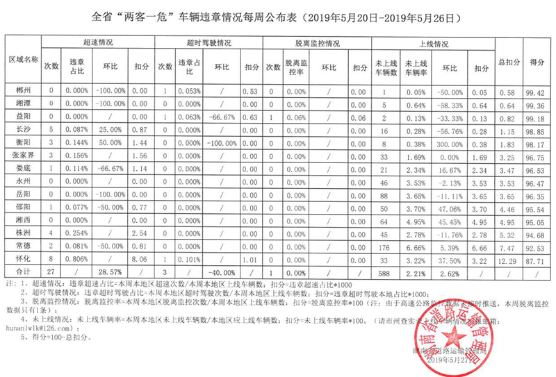 全省“两客一危”车辆违章情况一周公布表(2019年5月20日—5月26日)
