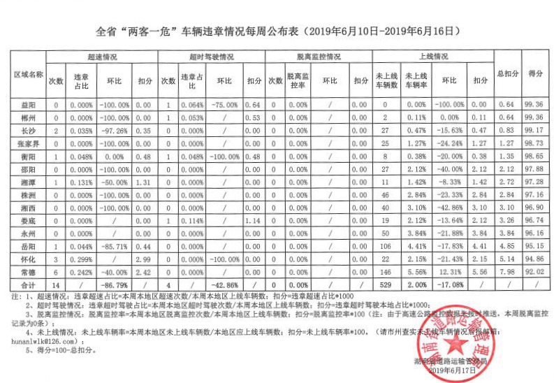 全省“两客一危”车辆违章情况一周公布表(2019年6月10日—6月16日)
