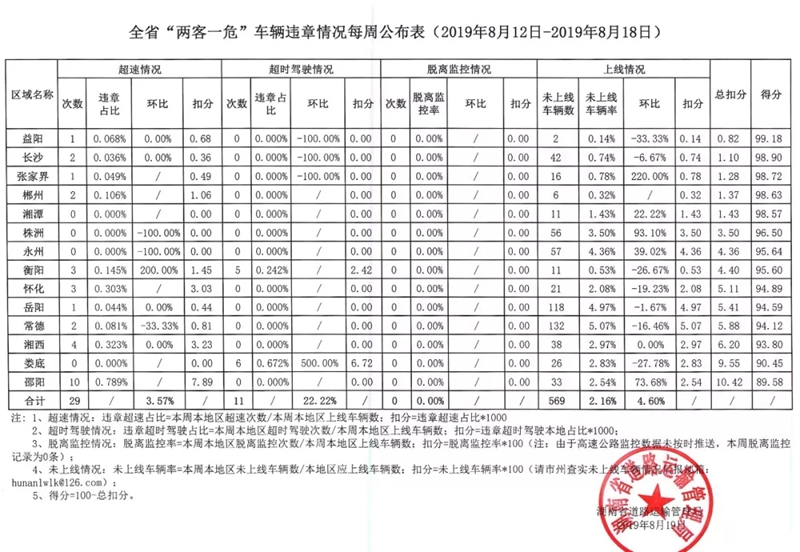 全省“两客一危”车辆违章情况一周公布表(2019年8月12日—8月18日)