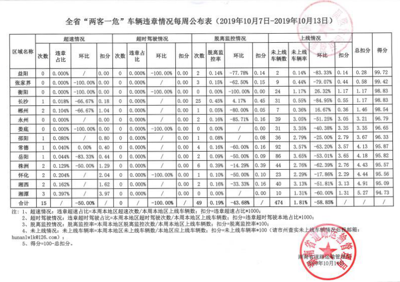 全省“两客一危”车辆违章情况一周公布表(2019年10月7日—10月13日)