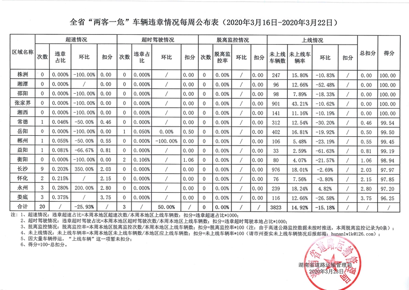 全省“两客一危”车辆违章情况一周公布表(2020年3月16日—3月22日)