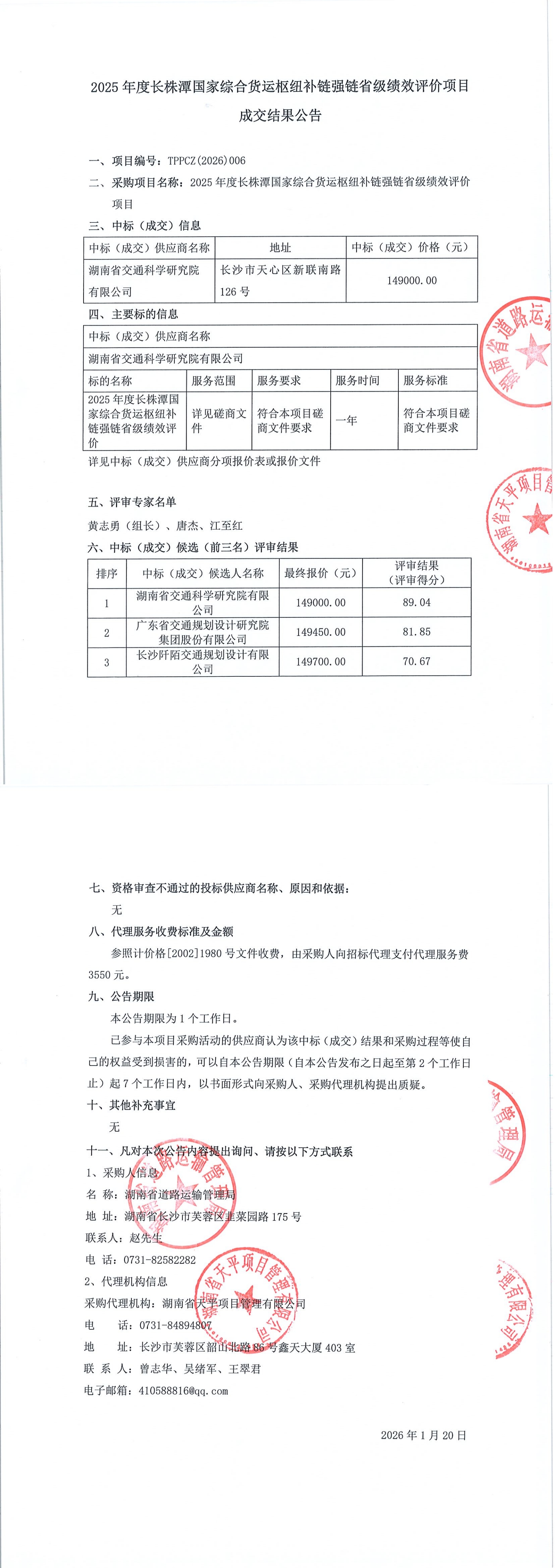 2025年度长株潭国家综合货运枢纽补链强链省级绩效评价项目成交结果公告