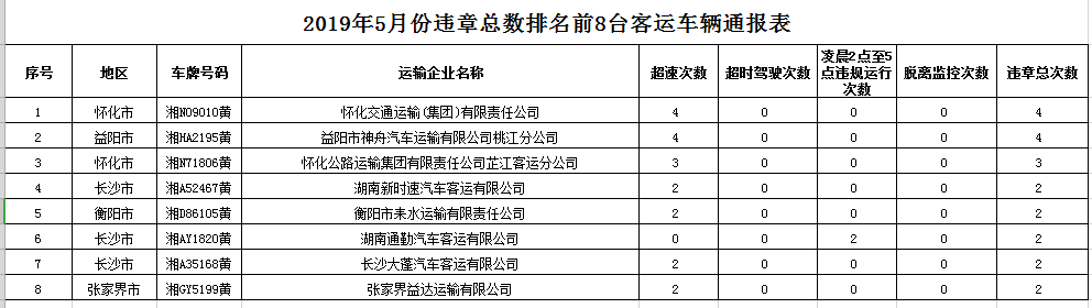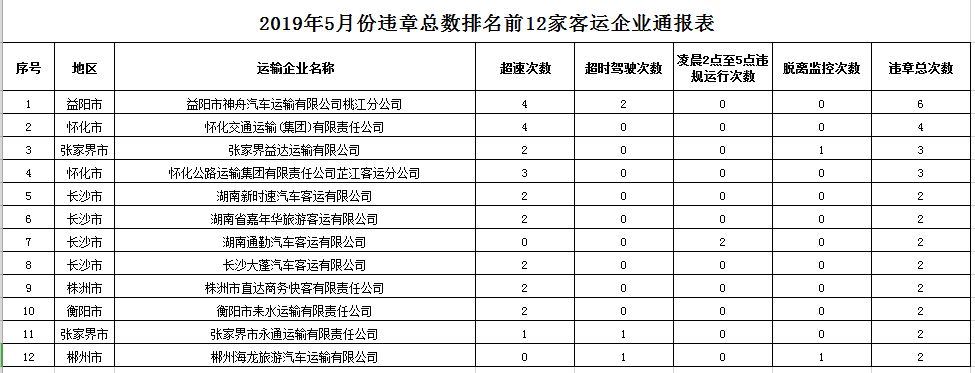 为确保道路运输“安全、畅通、有序、满意”,省道路运输管理局权威发布2019年5月1日至5月31日违章总数排名前12家客运企业、前8台客运车辆。