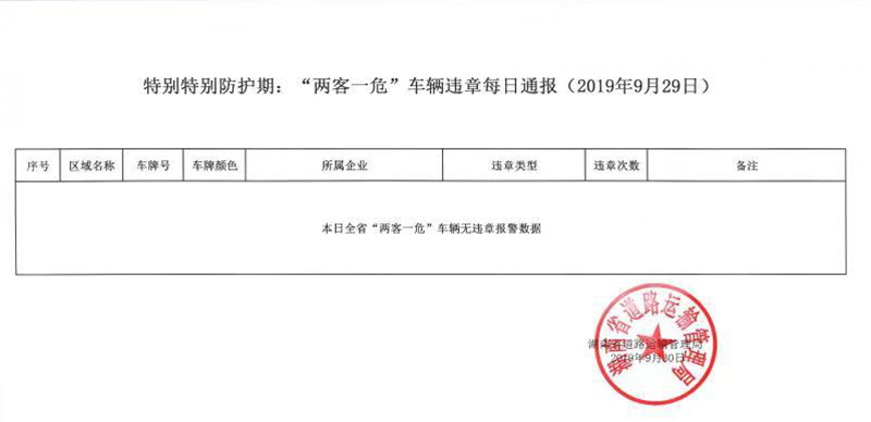 为确保新中国成立70周年大庆期间,全省道路运输行业安全稳定,9月26日至9月30日,省道路运输管理局官微每日通报全省“两客一危”车辆违章情况。特别特别防护期间连续两次被通报的车辆将受到历史最严惩戒:10月1日至7日停止营运!