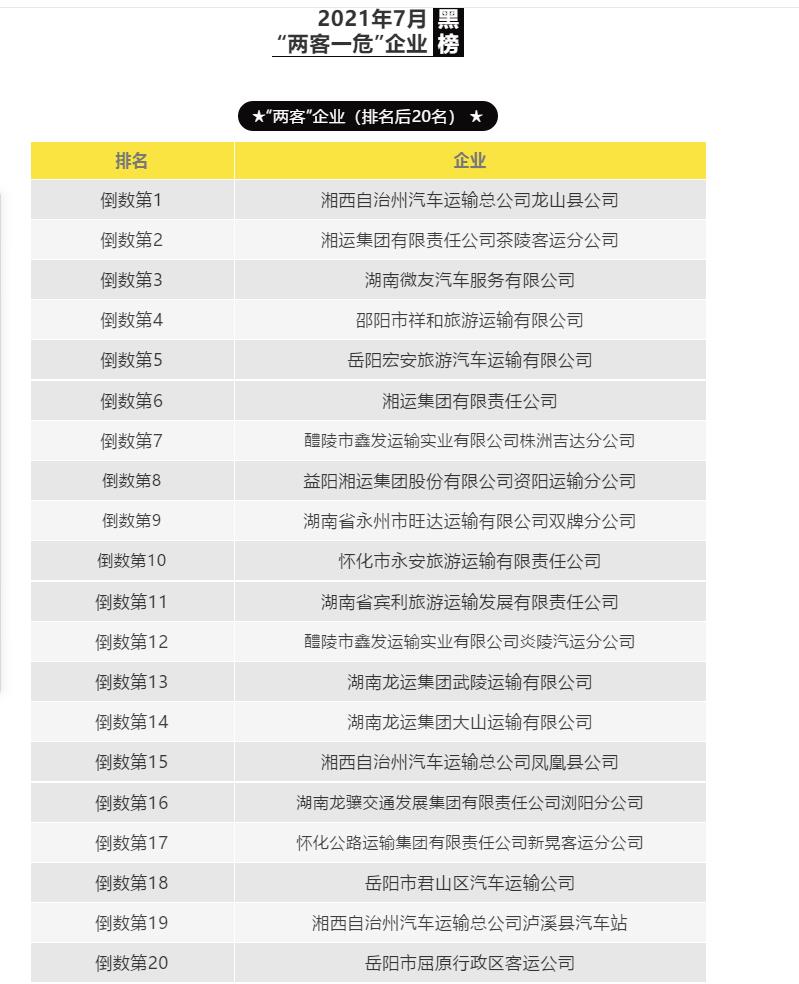 【编者按】为充分发挥我省“两客一危”车辆智能监管系统的作用,切实加强对“两客一危”车辆联网联控运行管理,依靠科技手段监管行业安全,确保道路运输行业杜绝重特大事故、遏制较大事故、减少一般事故的发生,根据省交通运输厅《湖南省“两客一危”车辆联网联控运行指标月度考核实施方案(修订版)》的要求,省道路运输管理局将对每月全省道路运输行业“两客一危”车辆联网联控运行指标考核情况进行通报。省道路运输管理局微信公众号专栏“每月红黑榜”,权威发布每月全省道路运输行业“两客一危”车辆联网联控运行指标考核情况通报,敬请关注! 考核标准 全省道路运输行业“两客一危”车辆联网联控运行指标考核内容主要包括交通运输部对全国各省考核的“两客一危”车辆联网联控系统运行数据指标以及我省“两客一危”车辆智能监管系统运行指标。 其中,运输企业考核指标设定区分“两客”企业和“危货”企业。 “两客”企业:本企业车辆联网联控系统运行指标(入网率、上线率、数据合格率、轨迹完整率、超速、超时驾驶、客车凌晨2点至5点违规运行)。本企业车辆智能监管系统运行指标(处置率、处理率、申诉驳回率、驾驶员突发情况报警、生理疲劳报警、使用手持电话报警、抽烟报警、未系安全带报警、不目视前方报警、超员驾驶报警、脱离监控报警)。 “危货”企业:本企业车辆联网联控系统运行指标(入网率、上线率、数据合格率、轨迹完整率、超速、超时驾驶、危货车辆离线位移)。本企业车辆智能监管系统运行指标(处置率、处理率、申诉驳回率、驾驶员突发情况报警、生理疲劳报警、使用手持电话报警、抽烟报警、未系安全带报警、不目视前方报警、驾驶员身份识别报警、押运员身份识别报警、脱离监控报警)。 2021年7月“两客一危”企业红榜