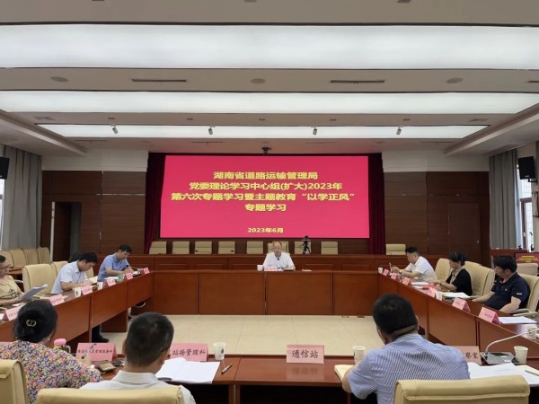 6月29日上午,省道路运输管理局党委理论学习中心组(扩大)举行2023年第六次专题学习暨主题教育“以学正风”专题学习研讨。局党委书记、局长谢伯平主持并讲话,在家局领导、局机关各科室和局属二级单位主要负责人参加。