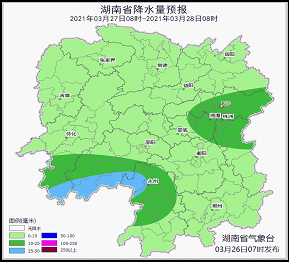 未来一周湘中以北雨量明显偏多,气温前高后低。26日至28日自北向南有一次降雨过程,29日至4月2日湘中以北有一次强降雨过程,其中30日至31日湘中以北局地暴雨,并伴有短时强降雨、雷暴大风、冰雹等强对流性天气,容易诱发山洪、地质灾害,同时对春耕春播有一定影响。