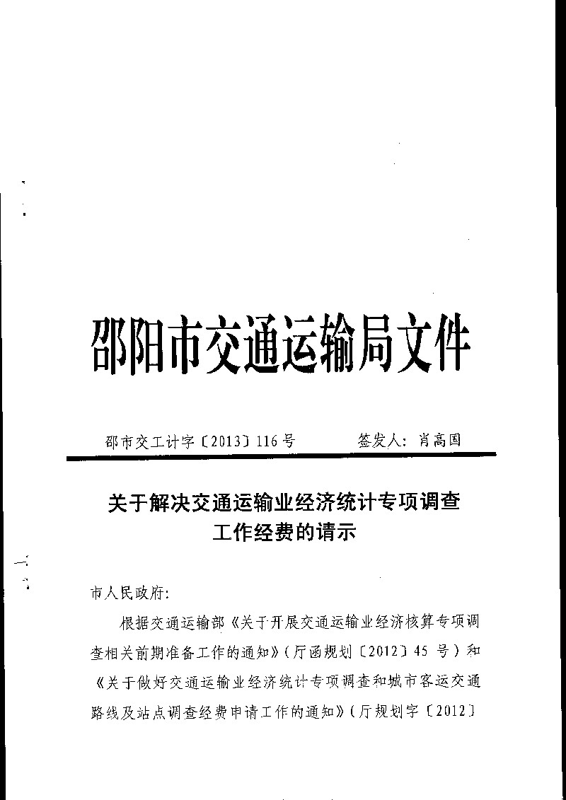 邵阳:关于解决交通运输业经济统计专项调查工作经费的请示