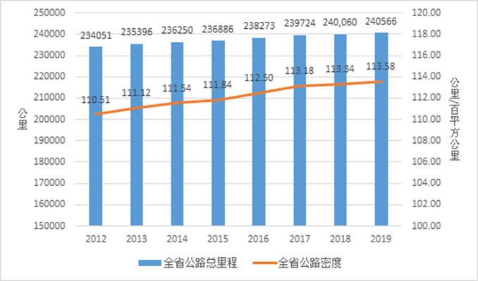 图1 2012-2019全省公路总里程及公路密度