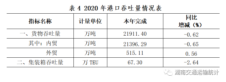 (四)港口生产与上年基本持平。全省港口完成货物吞吐量2.2亿吨,同比减少0.62%,其中内、外贸吞吐量同比分别下降0.65%和上升0.56%。完成集装箱吞吐量67.3万标箱,同比减少2.64%。