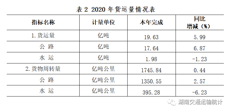 (二)货运总规模同比保持增长态势。全年完成公路水路营业性货运量19.6亿吨,同比增长6.0%。其中:公路完成17.6亿吨、增长6.9%,水路完成2.0亿吨,减少1.2%。完成营业性货物周转量1745.8亿吨公里,同比增长0.4%。