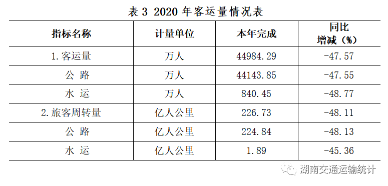 (三)客运呈持续恢复态势。全年完成公路水路营业性客运量4.5亿人,同比下降47.6%。其中:公路完成4.4亿人、减少47.5%,水路完成840.4万人,减少48.8%。完成营业性旅客周转量226.7亿人公里,同比下降48.1%;高速公路日均断面车流量16061辆,同比增加7.0%。