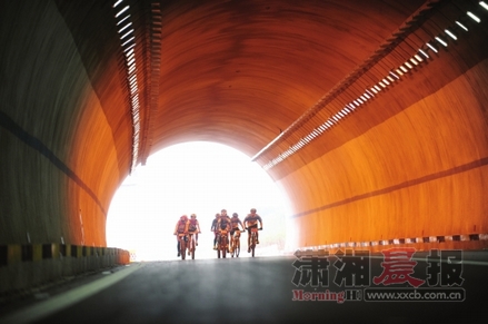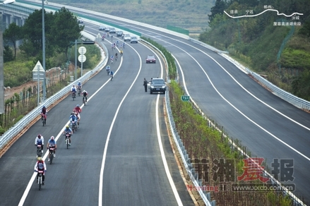 11月4日上午,在厦蓉高速湖南宁(远)道(县)段宁远南收费站前,“低碳高速行”2012年宁道高速自行车挑战赛鸣枪开赛。来自省内的7支参赛队伍110余名自行车业余爱好者,以低碳的形式,共同体验月底即将建成通车的宁道高速公路。而在即将通车的高速公路上举行自行车挑战赛,倡导低碳绿色出行,这在湖南省高速公路建设史上,还属首次。