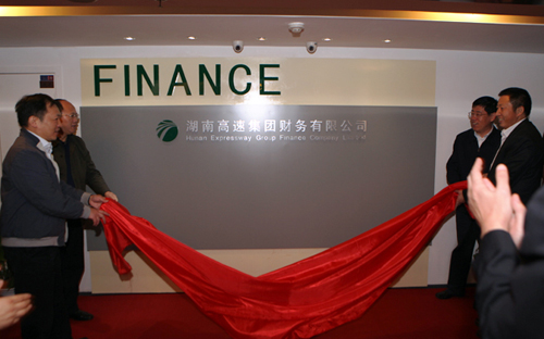 (省人民政府副省长韩永文,省交通运输厅党组书记、厅长贺仁雨,省交通运输厅党组成员、副厅长、省高管局局长吴国光,省银监局副局长朱远荣为湖南高速集团财务有限公司揭牌)