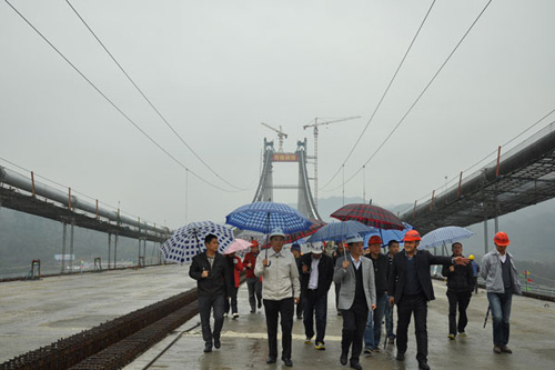 上午8点30分,赵平来到1-8合同段工地,了解工程进展和质量安全情况。在第8合同段张家界澧水特大桥桥面施工现场,赵平冒雨走完主桥全程,中途不时停下来与技术员交谈,了解大桥施工工艺,询问建设者们工作生活情况。他指出,澧水特大桥作为张花高速关键控制性工程,在克服地质情况复杂、条件艰苦等诸多困难后,工程进展顺利并坚持科技创新,项目建设者实属不易,成绩值得肯定。