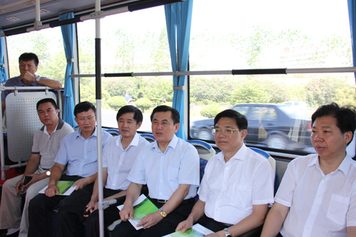(冯正霖副部长一行体验株洲市纯电动公交车。)