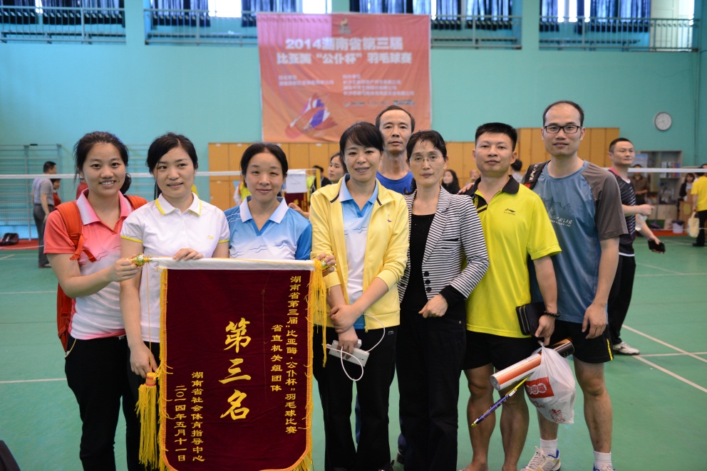 为贯彻实施《全民健身计划》,进一步推动全民健身运动的广泛开展,提高我省公务人员健康水平和身体素质,由湖南省实施全民健身计划指导委员会、湖南省体育局,中共湖南省直属机关工作委员会联合主办,湖南省羽毛球乒乓球运动管理中心、湖南省社会体育指导中心、湖南省羽毛球运动协会承办的2014湖南省第三届比亚酶“公仆杯”羽毛球比赛于5月10-11日在湖南体育职业学院省羽毛球乒乓球运动管理中心综合训练馆举行。此次比赛参赛队伍达48支,参赛人数近600人,为我省近些年来之最。我厅由机关党委、工会、妇委会联合组队参赛,经过运动员们两天的艰苦拚搏,取得了团体第三名的好成绩。