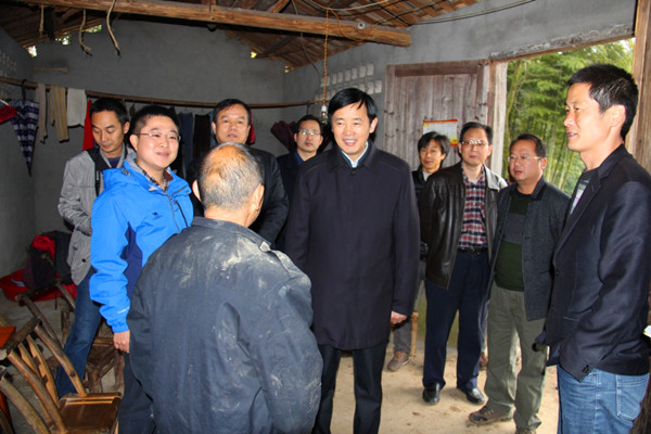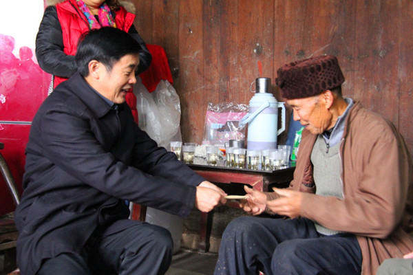 刘明欣一行沿着泥泞的山路先后深入3户贫困家庭走访慰问,详细询问每户家庭状况,了解生产生活情况,并为他们送上了慰问金。在10组贫困户年逾八旬的吴东清家中,刘明欣拉着老人的手,促膝交谈,嘘寒问暖。得知老人60多岁时丧子,夫妇俩为供养孙子上大学,年近八旬还外出务工,刘明欣被老人坚强韧性深深感动,他嘱咐老人保重身体,坚定信心,生活一定会一天比一天好。在2组残障家庭蒋世全家中,看到一家三口挤住一间十分简陋房屋,生活起居不便,刘明欣要求工作队和村支两委尽快帮助改善居住条件,让贫困群众安居乐业。在年仅20岁的癫痫病患者蒋祥瑜家里,刘明欣鼓励他要坚强乐观,注意日常保健,坚持治疗,早日摆脱病魔困扰。他还特别嘱咐工作队和村支两委帮助其加强治疗,妥善照顾好日常生活。