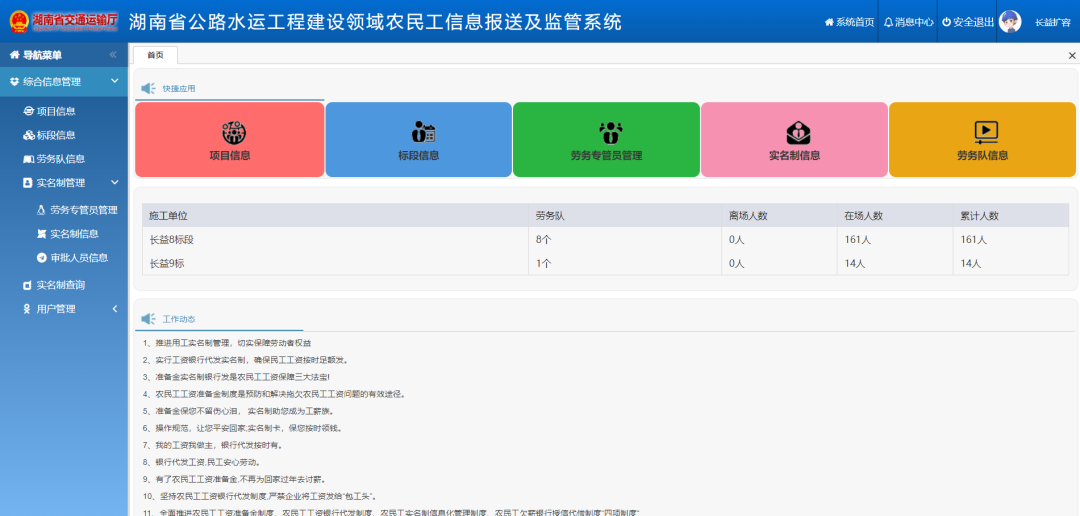 2020年初,省厅修订出台的《湖南省公路水运工程建设领域农民工工资支付管理办法》(湘交基建规(2020)1号),《办法》明确了全省公路水运建设领域项目各参建单位、各交通主管部门及行业管理机构在建设各环节的职责,构建从工程审仳、工程款拨付、农民工用工管理、工资支付、信用评价等项目建设过程全链条、全流程、多环节的综合治理体系,将农民工合法权益的保障措施贯穿交通建设领域始终,从而实现根治拖欠农民工工资问题的目的。