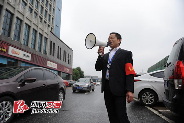 长沙服务区志愿者姜建潮正在用扩音器喊话,疏导进入服务区的车辆。(摄影 江钻)