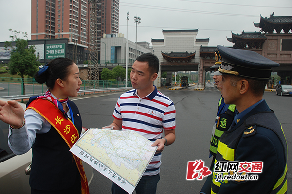 长沙收费站志愿者正在给前往湘阴的黎先生(左二)讲解行车路线。