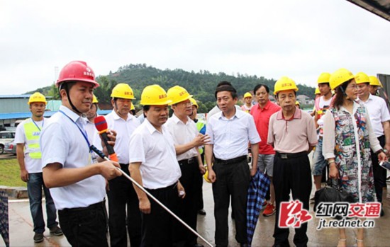 2016年6月29日,湖南省交通运输厅邀请10余名国省人大代表、政协委员一行赴益阳视察指导交通运输工作。图为视察组一行在益娄高速公路2标施工现场了解项目建设管理情况。摄影通讯员李爱民