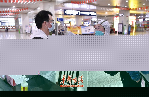 在湘江新区综合交通枢纽客运站,医务人员正在为旅客测量体温。