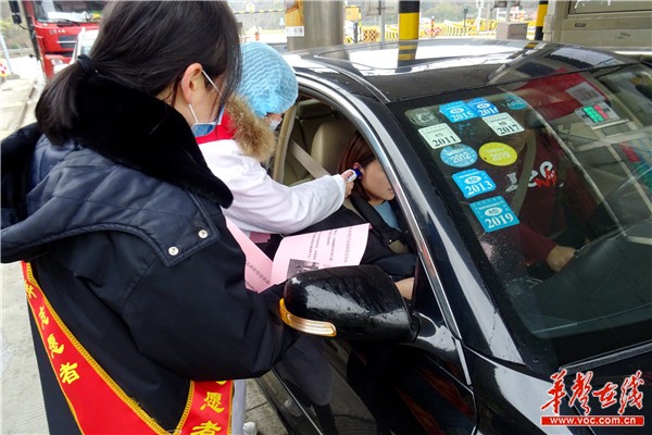 湖南高速衡阳管理处工作人员正在对司乘人员进行体温测量。