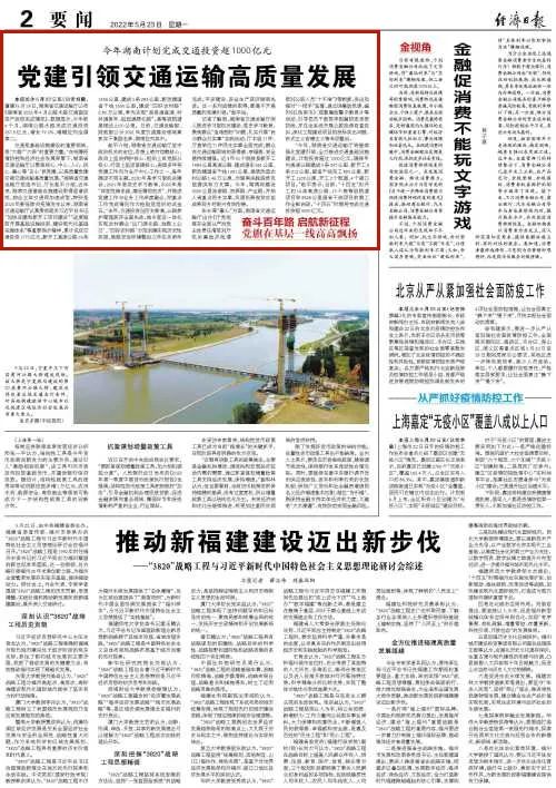 编者按:思想是行动的先导,党建是业务的根魂。在统筹疫情防控和经济社会发展背景下,湖南省交通运输厅“紧跟核心”“聚焦中心”“凝聚人心”“情系民心”“永葆廉心”,以党建引领湖南交通运输高质量发展,得到中组部的充分肯定。5月23日起,经济日报推出“党旗在基层一线高高飘扬”专栏,开篇以“今年湖南计划完成交通投资超1000亿元党建引领交通运输高质量发展”报道我厅工作。