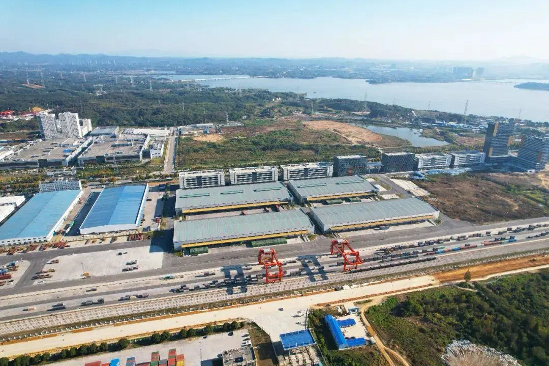 在“示范工程”的主要承载地——湖南城陵矶新港多式联运物流园,崭新、宽阔的物流仓储厂房、办公楼鳞次栉比,松阳湖铁路专用线如一条长龙穿行其间,构成城陵矶新港铁水联运的重要脉络。据悉,松阳湖铁路专用线于去年9月正式通车运营,向西北经中欧班列连接新疆,出中亚,进欧洲;向南连接粤港澳大湾区,对接湘粤非铁海通道;向西南连接广西钦州港,连接西部陆海新通道。城陵矶新港铁水联运辐射能力得到极大增强。