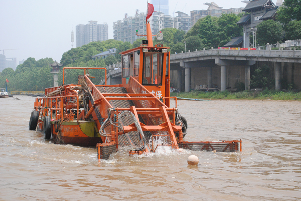“你看一个废篮球等物体即刻被吸进打捞漂浮物体滾动收集装置内,这艘全自动化打捞船和另7艘人工打捞漂浮物船,让长沙库区有了‘天天清’,告别了无专业环保船队的历史。”4月28日智成保洁公司项目负责人在湘江上介绍。