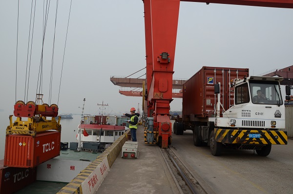 1月27日,长沙新港集装箱泊位纵向停靠的“湘远10号”等3艘3000吨级的集装箱货轮, 装卸工忙着分船同时卸箱装车。据该港快报预算统计,当月集装箱吞吐可超过1.2万TEU(标箱),创新港投产以来首月单月最高纪录, 喜迎新年“开门红”。