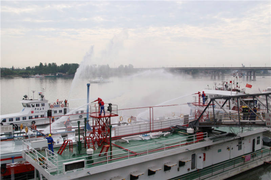 6月17日上午,湖南省(常德·2021)水上应急救援综合演习在沅水中石化常德分公司德山油库码头水域举行。