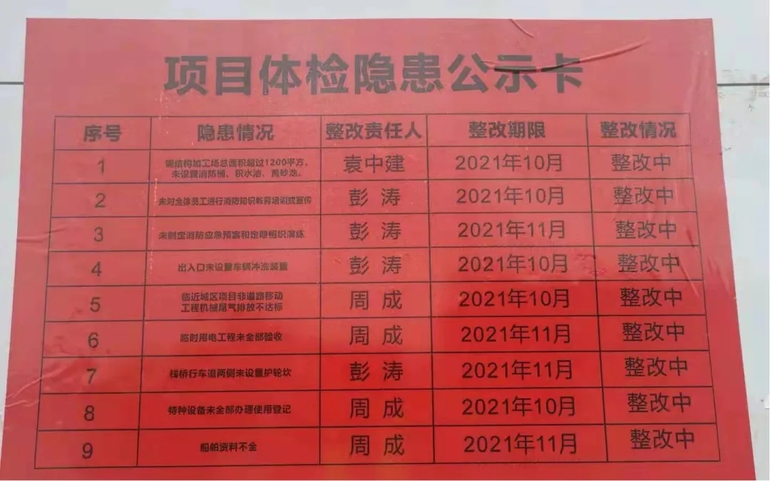 长沙市交通质监站还对“三卡”进行了创新,在“项目体检卡”中增设了隐患公示等相关要求,要求各项目及时在施工现场出入口及作业区域公示“项目体检卡”中发现的隐患,注明隐患整改责任人和整改措施,定期公示隐患整改进度,提醒作业人员安全防护措施,让全体作业人员能够安心工作。