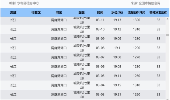 今年3月的城陵矶七里山站水文信息,长期处于历史最低水位。(图源:全国水情信息网)